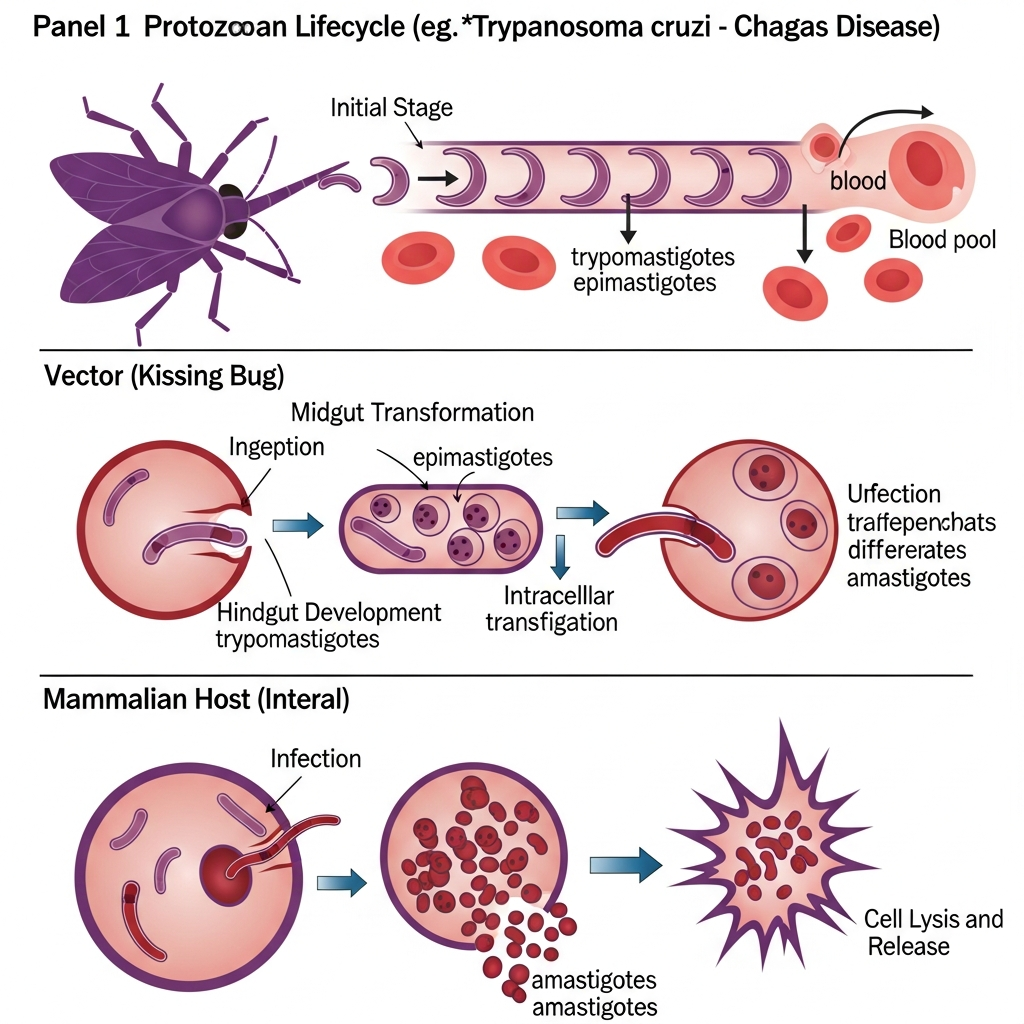 Doenças causadas por protozoários incluem: malária (Plasmodium), doença de Chagas (Trypanosoma cruzi), leishmaniose (Leishmania), amebíase (Entamoeba histolytica), giardíase (Giardia lamblia) e toxoplasmose (Toxoplasma gondii).