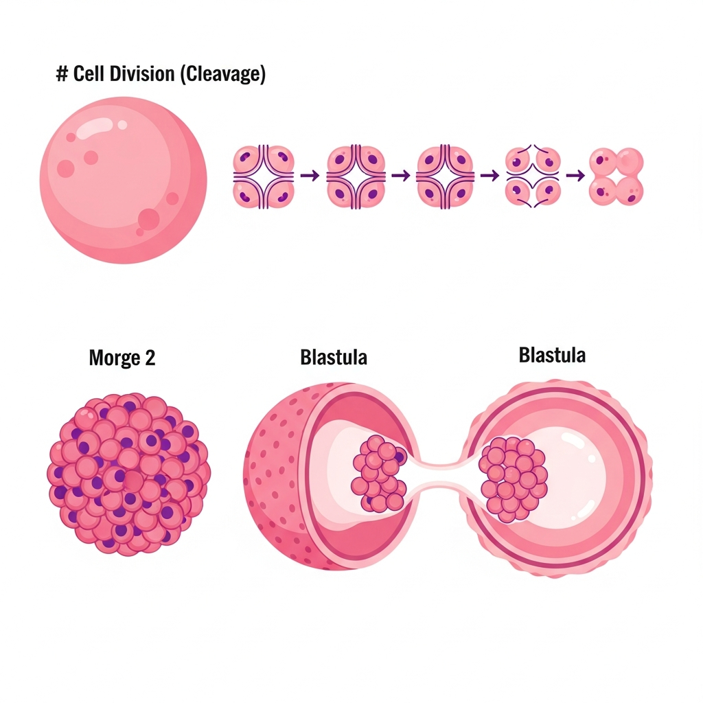 Após a fecundação, o zigoto passa por clivagem (divisões celulares rápidas), formando a mórula e depois a blástula (com a blastocele). Na gastrulação, formam-se os folhetos germinativos: ectoderma, mesoderma e endoderma.