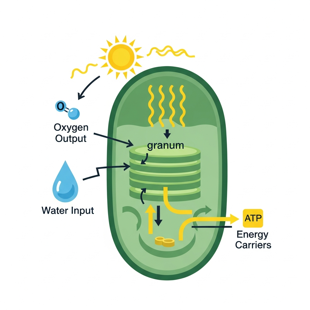 A fase clara (fotoquímica) ocorre nos tilacoides, onde a luz é absorvida pela clorofila. A água é quebrada (fotólise), liberando O₂. Produz-se ATP e NADPH.