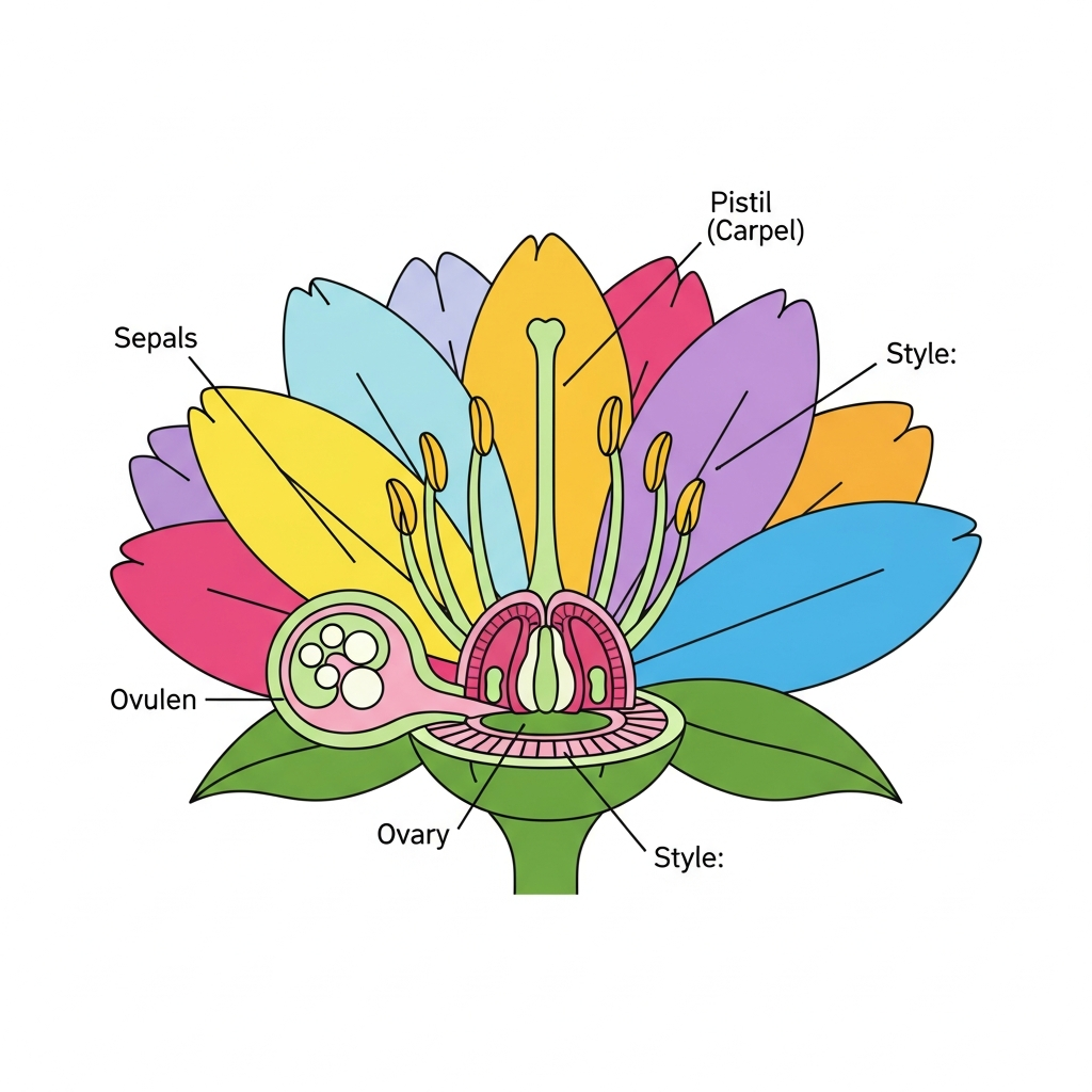 A flor possui cálice (sépalas), corola (pétalas), androceu (estames – parte masculina) e gineceu (carpelos – parte feminina). Os estames produzem pólen. O carpelo contém ovário, estilete e estigma.