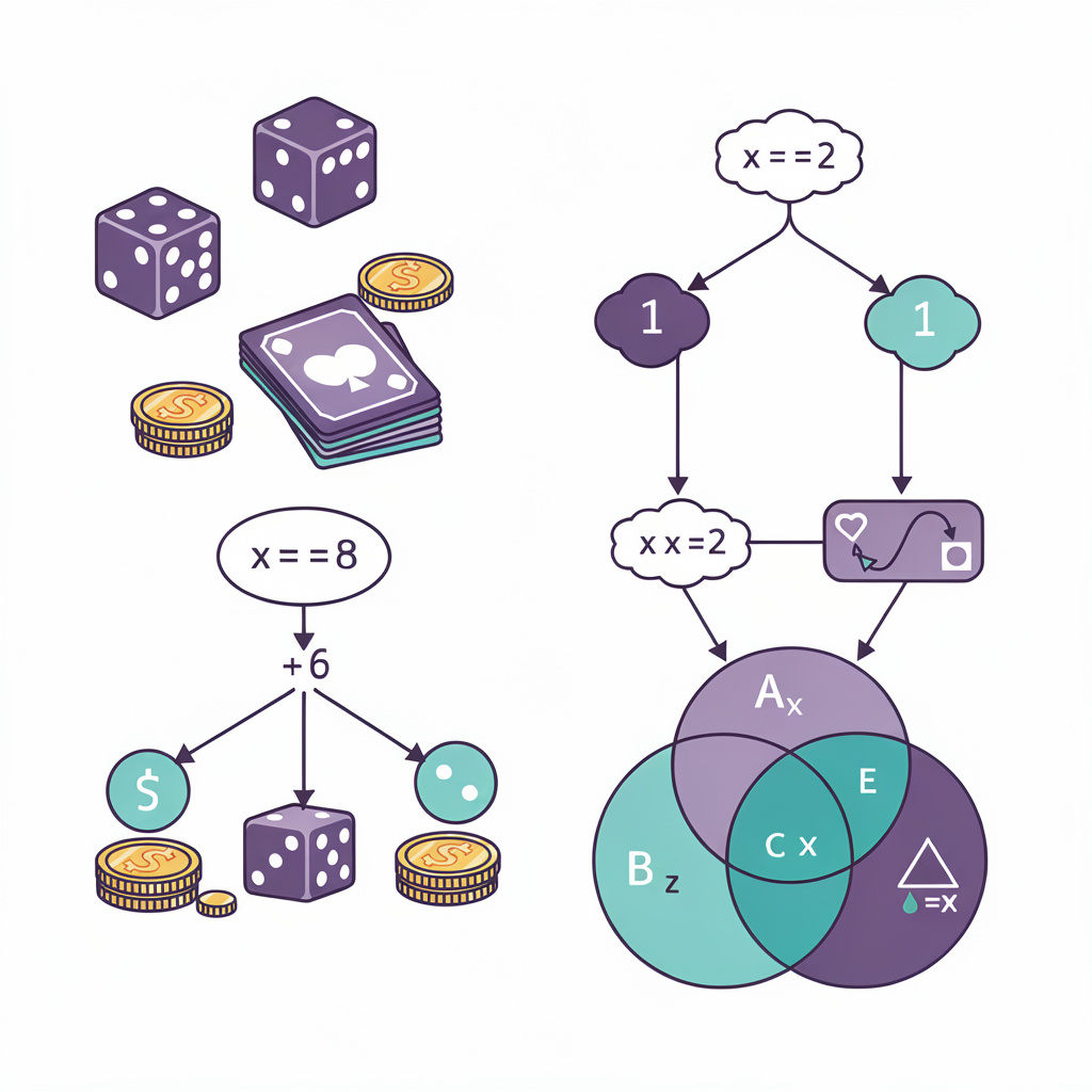 Eventos mutuamente exclusivos são aqueles que não podem ocorrer simultaneamente. Por exemplo, ao lançar um dado uma vez, os eventos “sair 3” e “sair 5” são mutuamente exclusivos. Para esses eventos, a probabilidade de ocorrer um OU outro é a soma das probabilidades individuais.