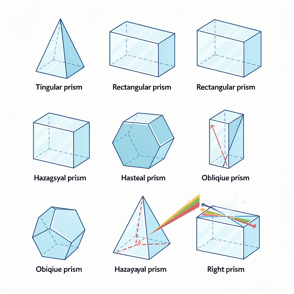 Os prismas são classificados pelo polígono da base: triangular (3 lados), quadrangular (4 lados), pentagonal (5 lados), hexagonal (6 lados), etc. O cubo e o paralelepípedo são casos especiais de prismas quadrangulares.