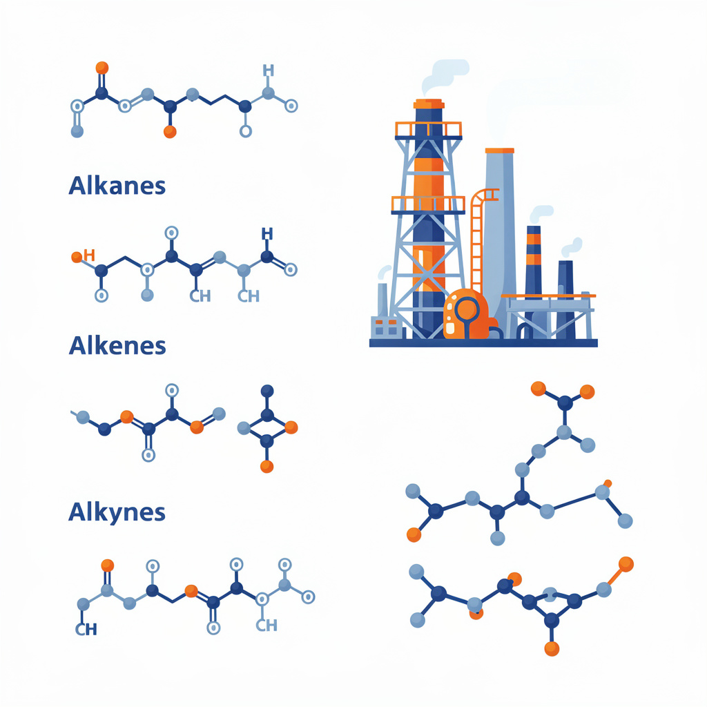 Os hidrocarbonetos são classificados de acordo com o tipo de ligação entre os carbonos e a estrutura da cadeia. Os alcanos (parafinas) possuem apenas ligações simples e seguem a fórmula geral CₙH₂ₙ₊₂. Os alcenos (olefinas) apresentam uma dupla ligação (CₙH₂ₙ), enquanto os alcinos possuem uma tripla ligação (CₙH₂ₙ₋₂).
